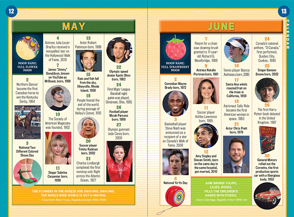 | Shrieks of “Cool!” and “Gross!” when my kids read about the pink fairy armadillo are followed by “Can we make this?” when the dirt cake recipe is discovered. They scour the calendar pages looking for what happened in history on their birthdays (Tyrannosaurus rex bones discovered in 1990 and a canoe deposited onto telephone wires by a storm in 1965). They test each other’s funny bones with the riddles and jokes sprinkled throughout the pages. And oh, the toucan on the cover: “It is looking right at me!” |